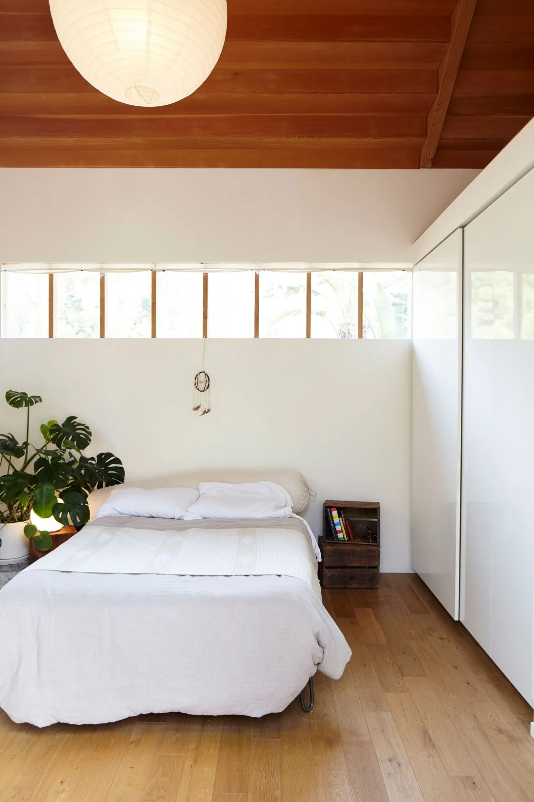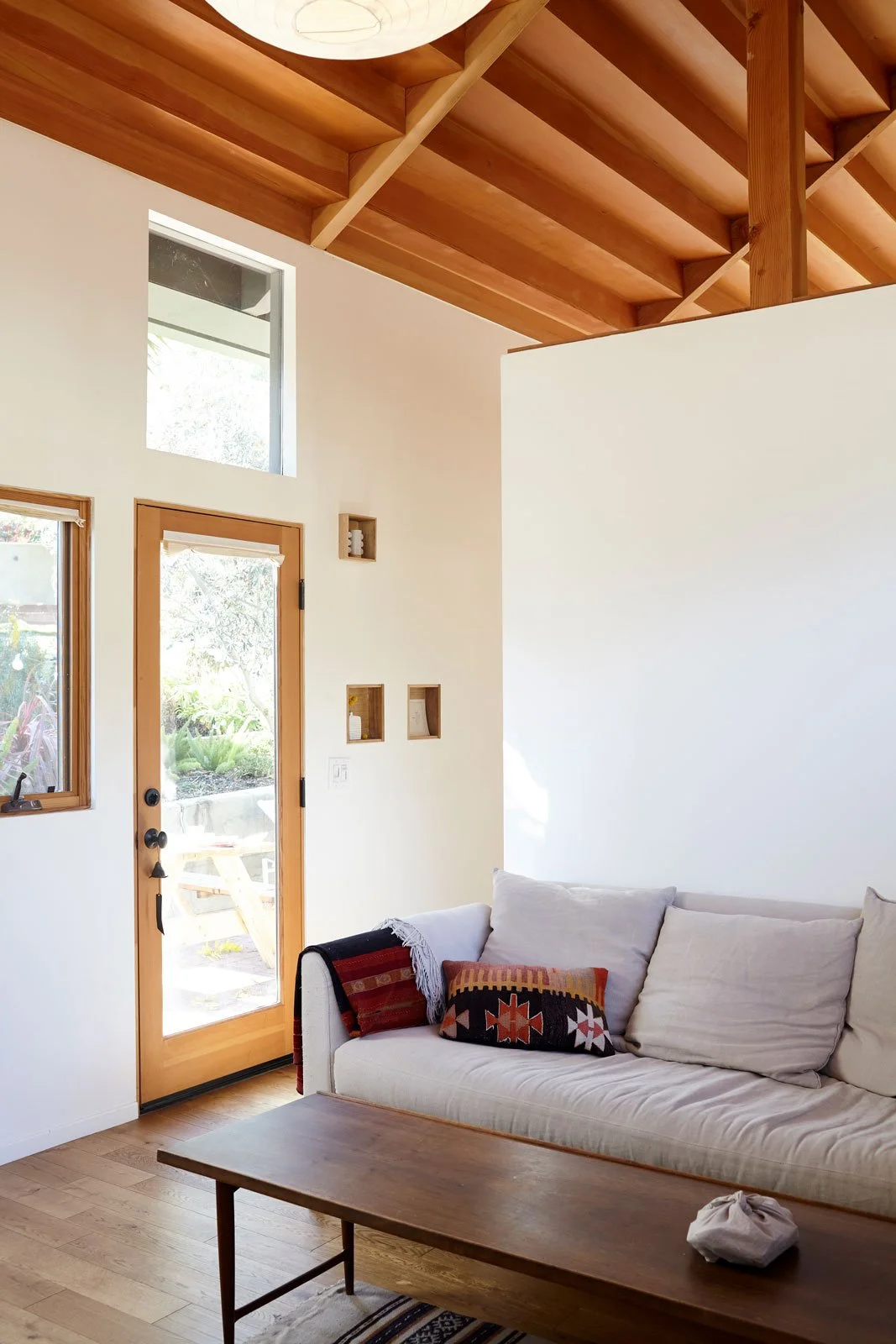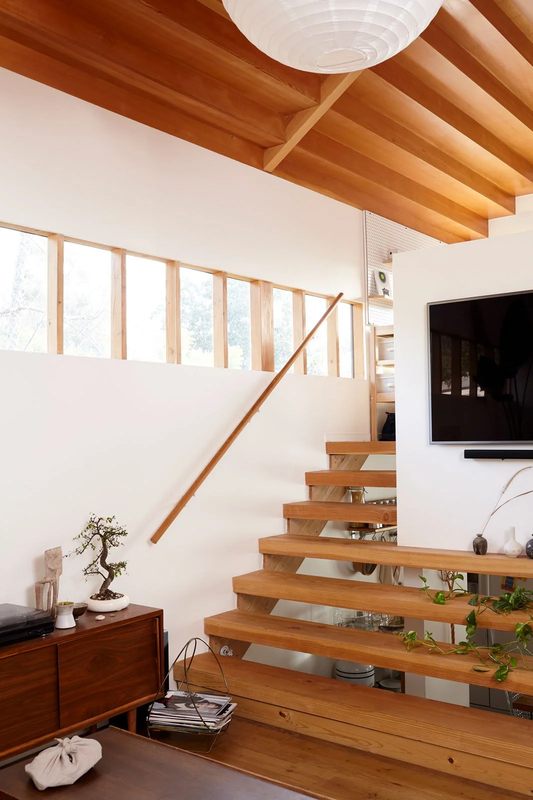 Located in Solano Canyon next to downtown Los Angeles, the two bedroom, one bath house frames the natural surroundings and creates a cabin like space that is contemporary but also warm and intimate. The ceiling, made of clear douglas fir, emphasizes the linearity of the house and helps make the house feel bigger as well as cozy.