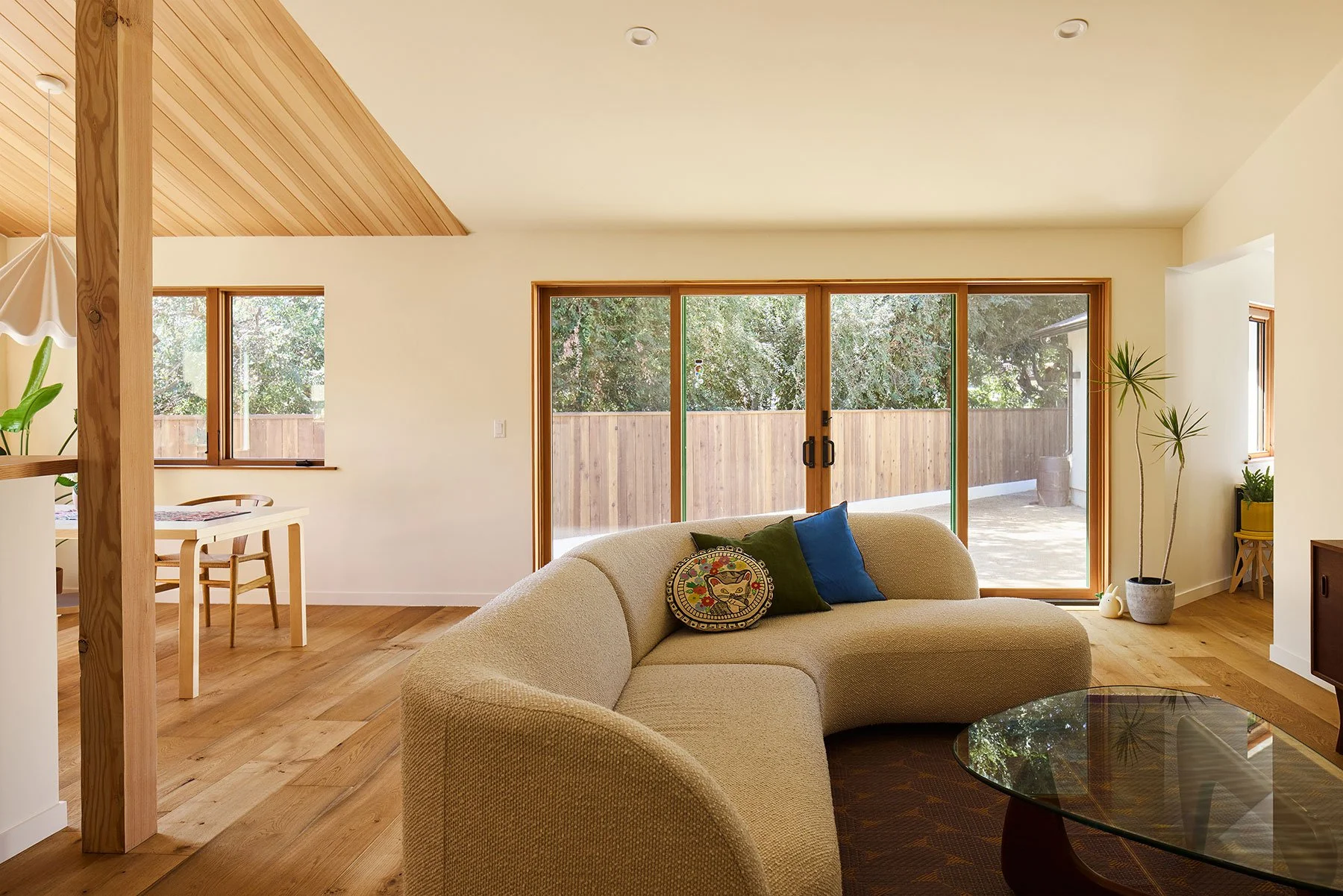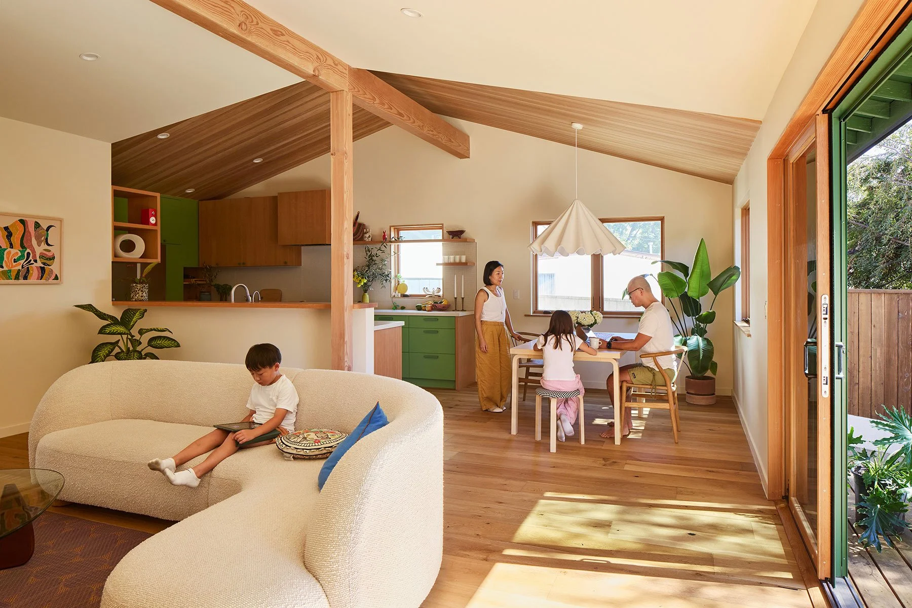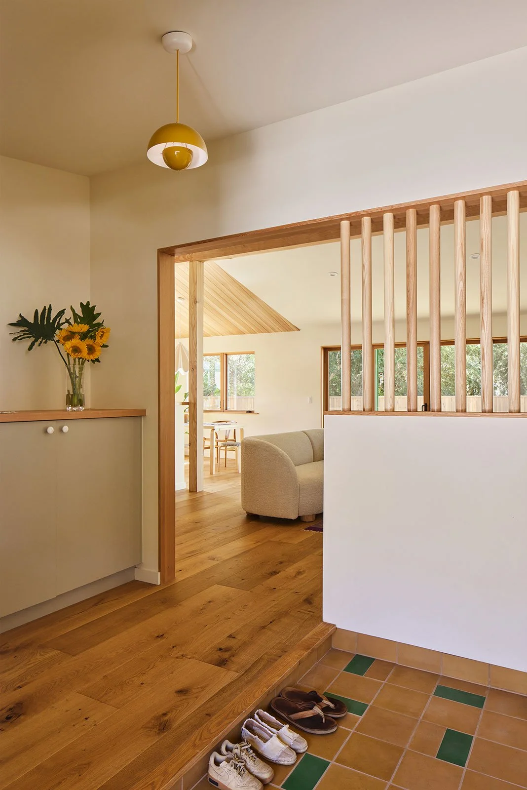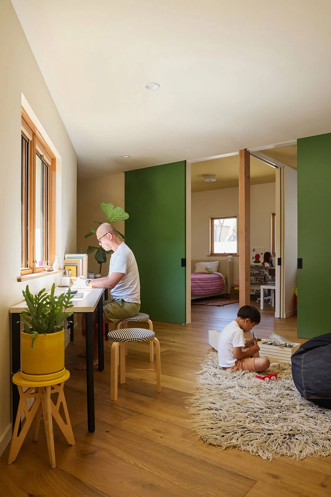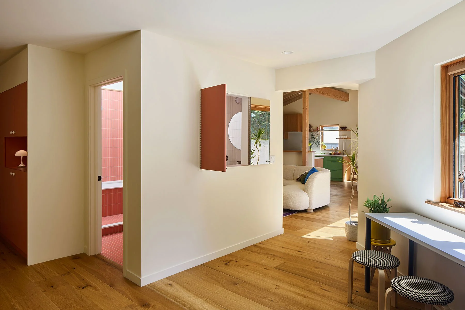 The house sits on a triangular lot and the original house design followed the shape of the lot which made for some very strangely shaped interior spaces. We squared out the interior spaces, made new connections to the outside from each space of the house. The client is a family from Japan and requested that the entrance be more transitional so we lowered and tiled a genkkan space that gently brings folks into the house. A triangular remnant of the old house stayed and became a new transition between the private and public zones. The two kids rooms open up to this space with large sliding doors. If your kid is always playing in the middle of everything (ie; in your way, under your legs) this is the place for them.The big sliders allow the bedrooms to adapt to kids’ needs and want of individual space. Mirrored peek-a-boo window from the bathroom creates a sense of casualness to the house as well as ventilation.