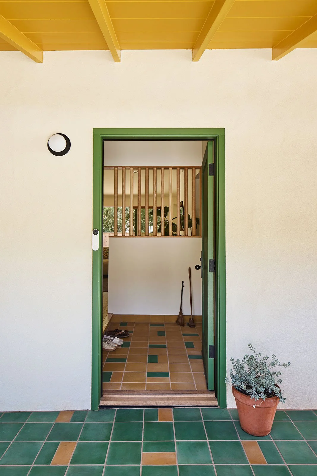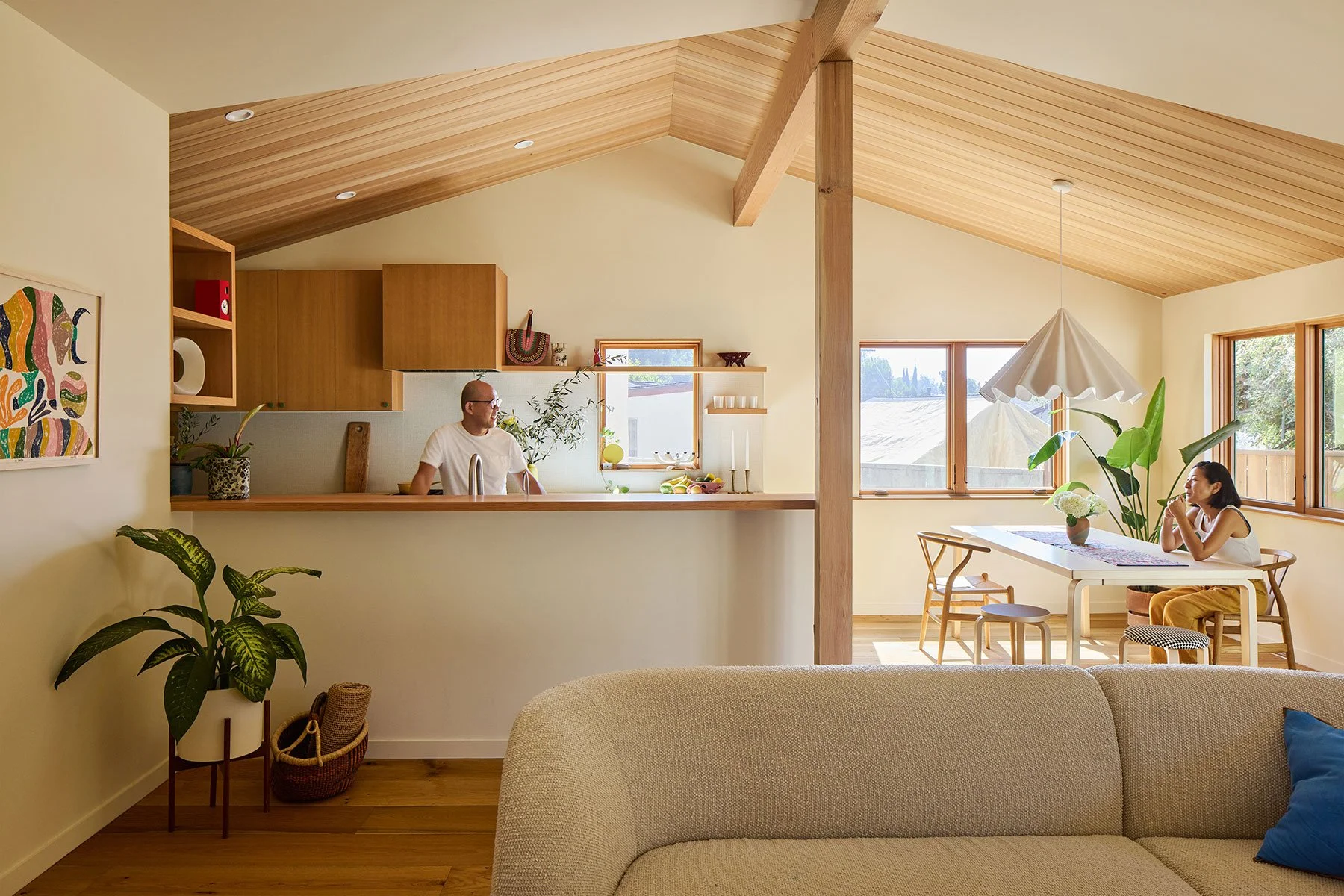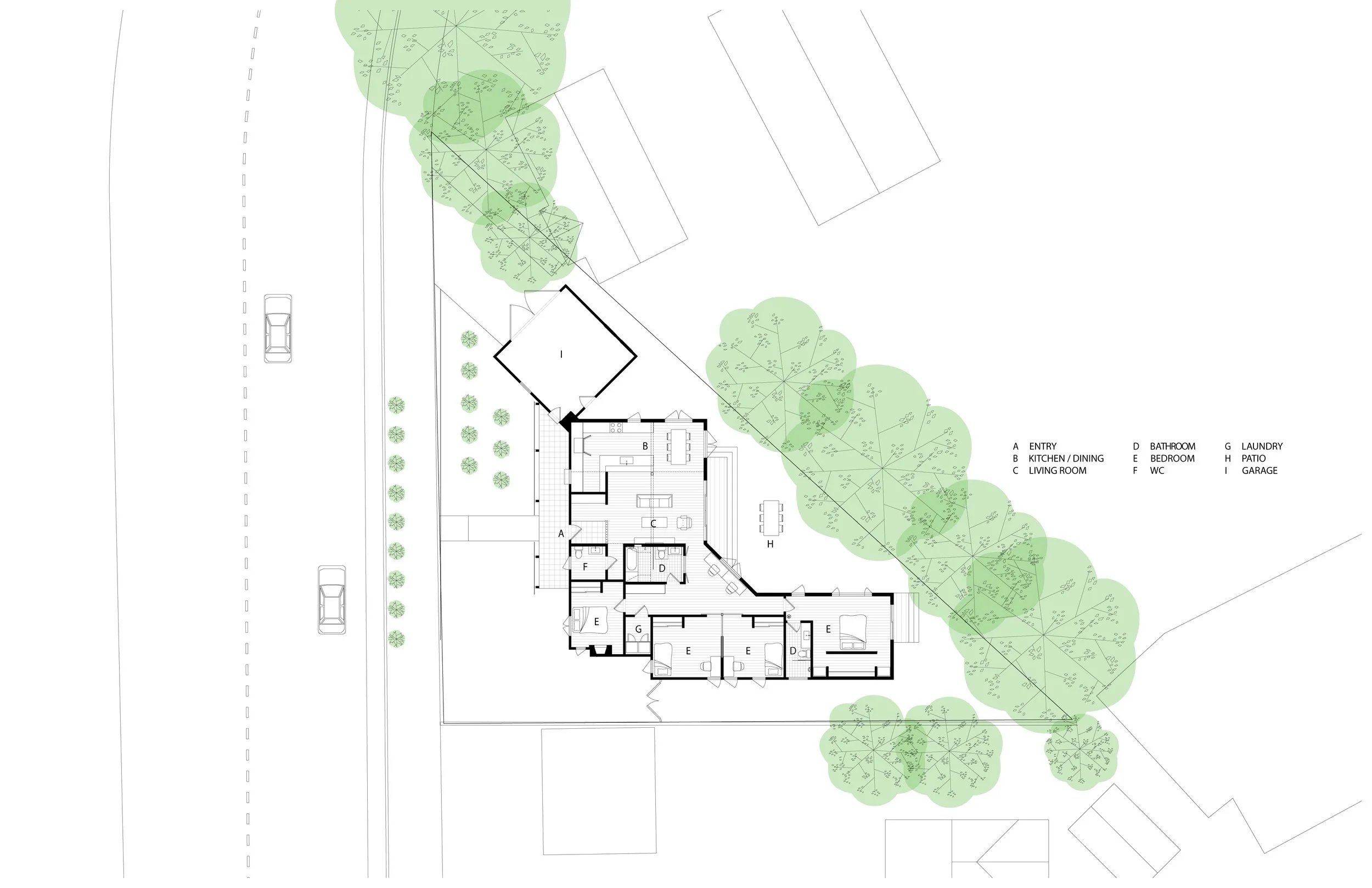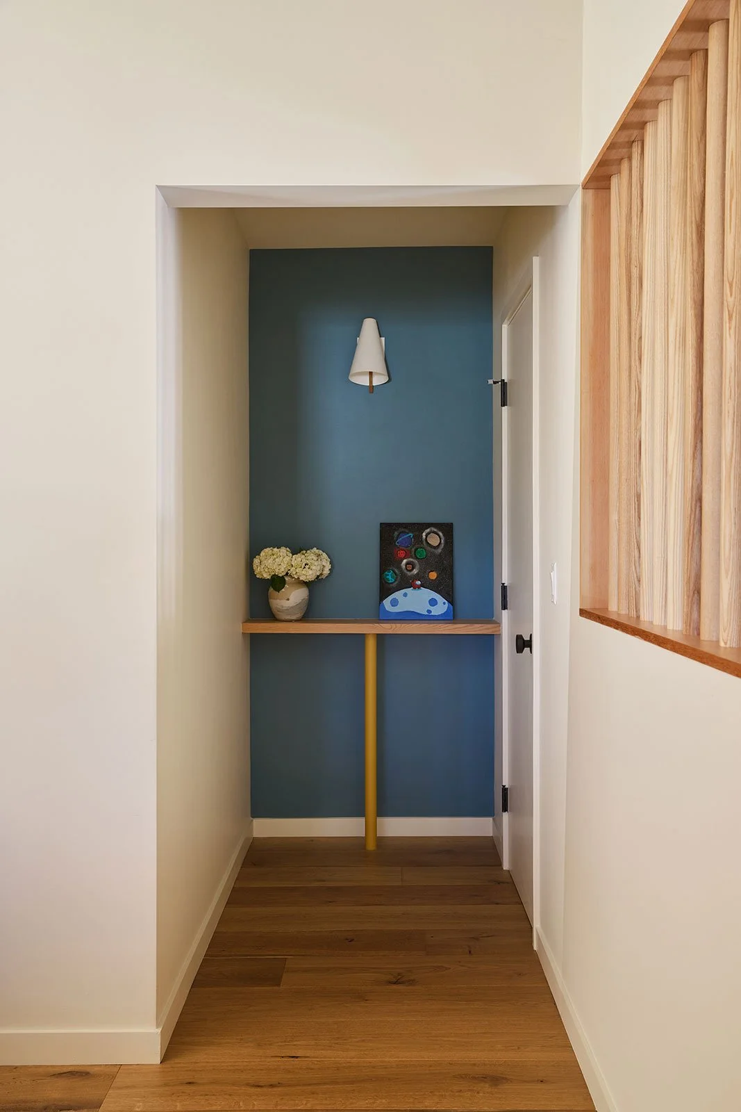 The house sits on a triangular lot and the original house design followed the shape of the lot which made for some very strangely shaped interior spaces. We squared out the interior spaces, made new connections to the outside from each space of the house. The client is a family from Japan and requested that the entrance be more transitional so we lowered and tiled a genkkan space that gently brings folks into the house. A triangular remnant of the old house stayed and became a new transition between the private and public zones. The two kids rooms open up to this space with large sliding doors. If your kid is always playing in the middle of everything (ie; in your way, under your legs) this is the place for them.The big sliders allow the bedrooms to adapt to kids’ needs and want of individual space. Mirrored peek-a-boo window from the bathroom creates a sense of casualness to the house as well as ventilation.
