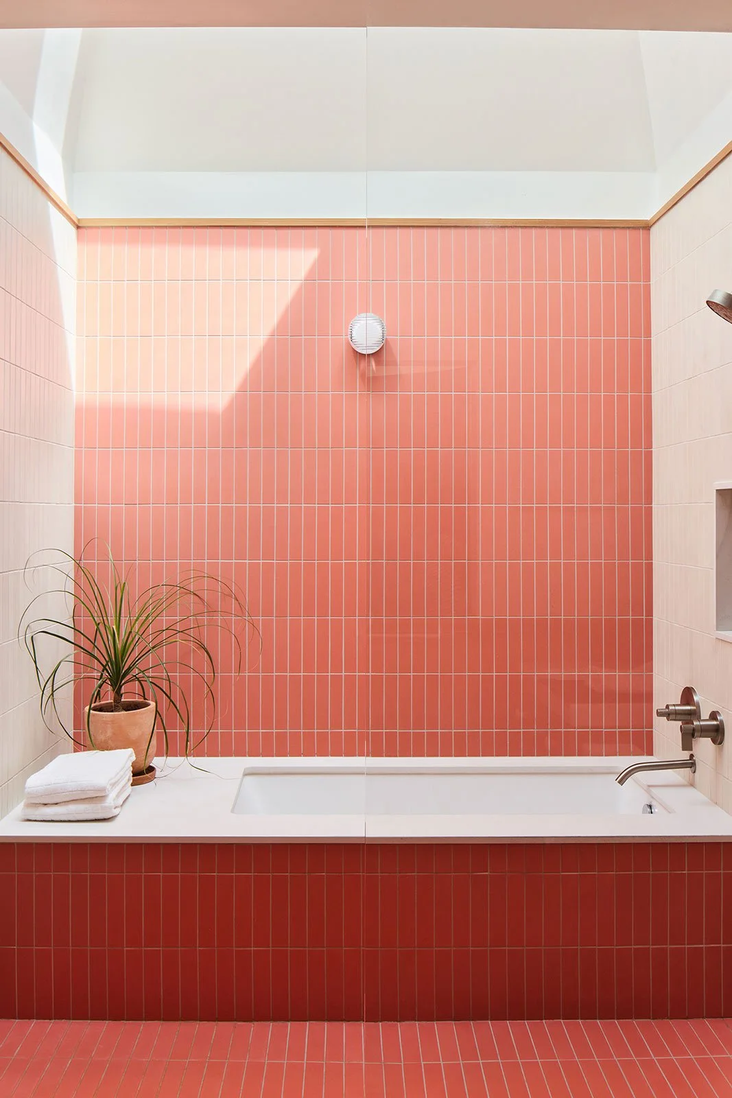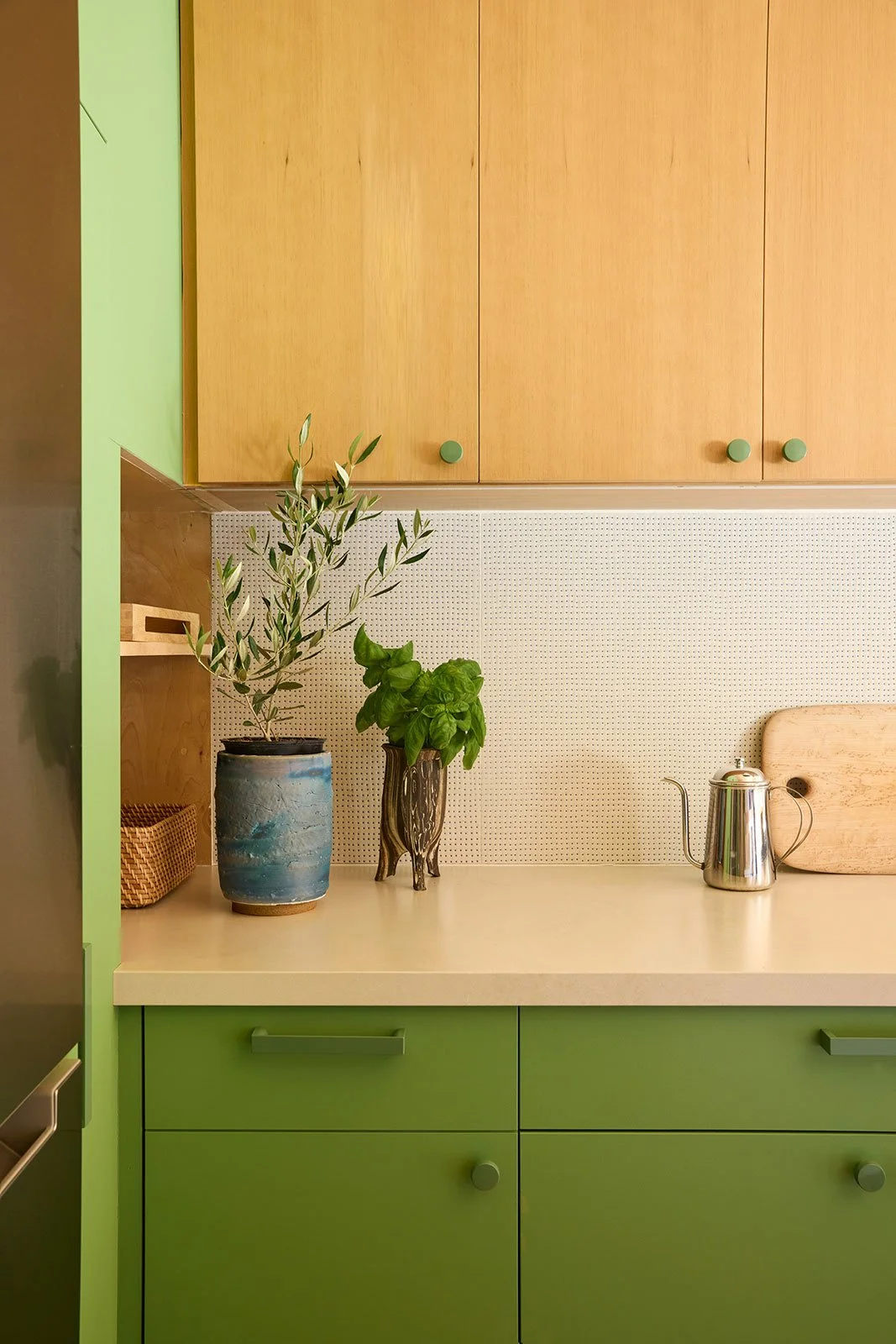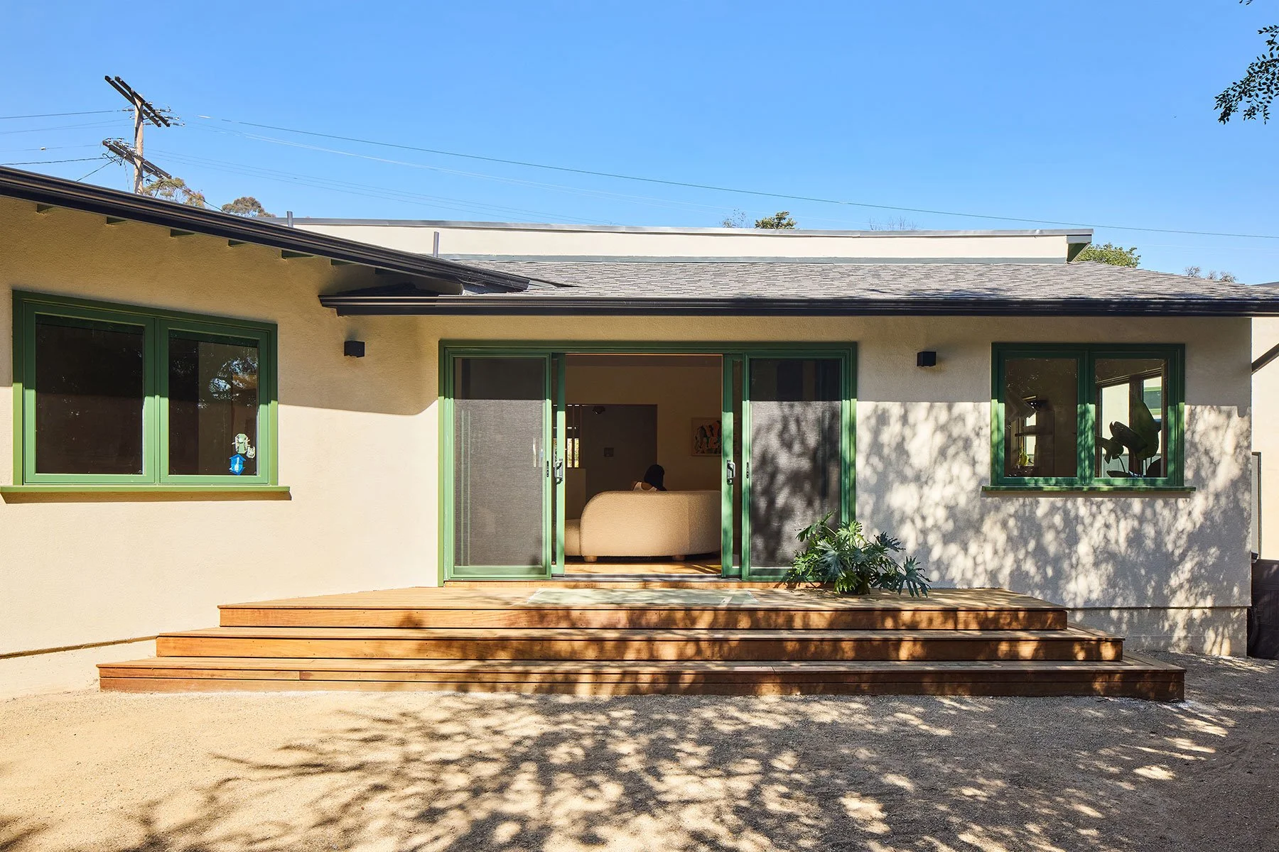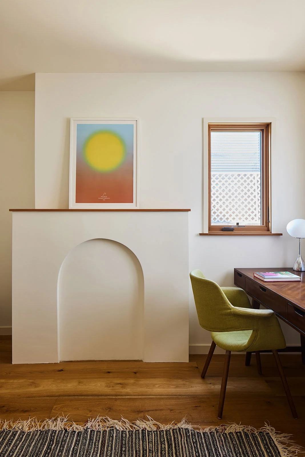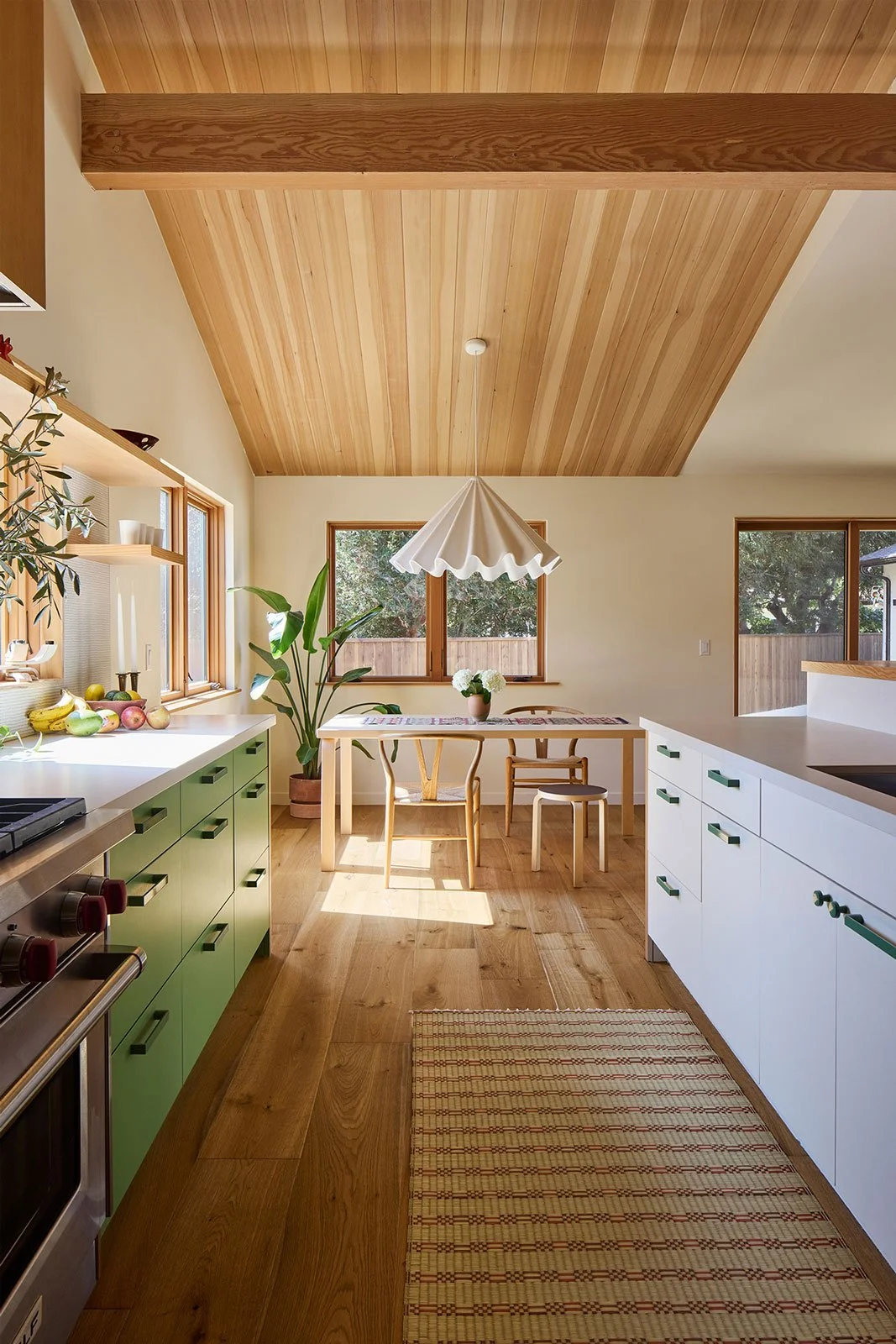 The house sits on a triangular lot and the original house design followed the shape of the lot which made for some very strangely shaped interior spaces. We squared out the interior spaces, made new connections to the outside from each space of the house. The client is a family from Japan and requested that the entrance be more transitional so we lowered and tiled a genkkan space that gently brings folks into the house. A triangular remnant of the old house stayed and became a new transition between the private and public zones. The two kids rooms open up to this space with large sliding doors. If your kid is always playing in the middle of everything (ie; in your way, under your legs) this is the place for them.The big sliders allow the bedrooms to adapt to kids’ needs and want of individual space. Mirrored peek-a-boo window from the bathroom creates a sense of casualness to the house as well as ventilation.