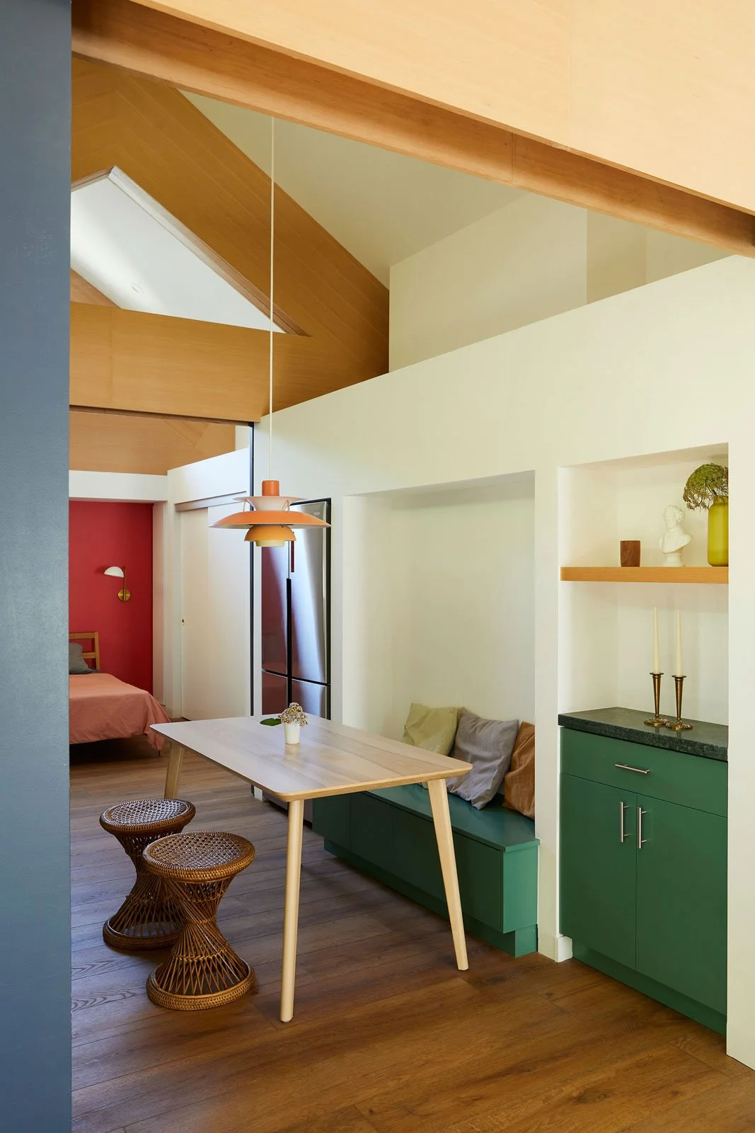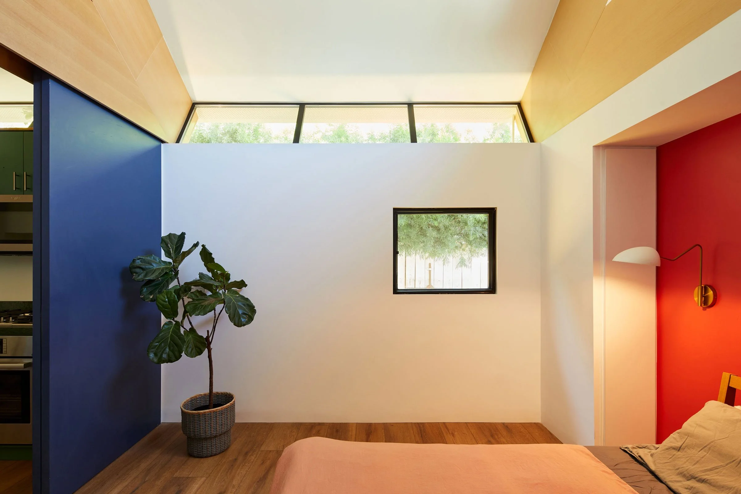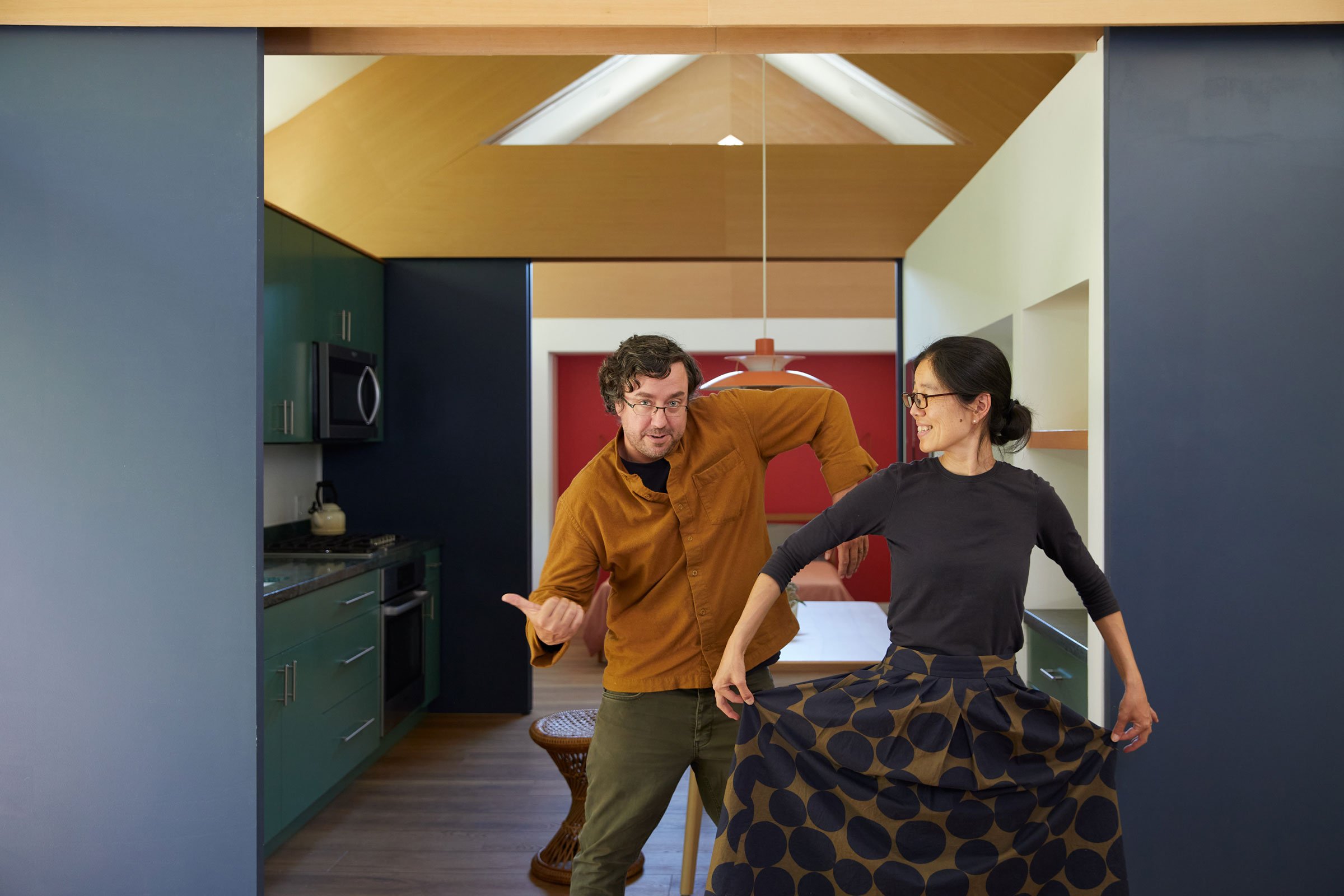 How do you make something small feel big? That was the question we were asking ourselves when skinny David Byrne popped into our head and his awesome Big Suit from the seminal 1984 film Stop Making Sense. Similar to his suit which has an armature cleverly placed between his skinny frame and the suites flowing fabric, we decided to fatten up the trusses pulling the ceiling away from the top of wall creating a wrap around clerestory and an interior volume that feels inflated. Once you separate the skin from the frame its amazing at how loose everything feels, movement flows, light seeps through and the whole structure becomes more of a framework than a solid mass.